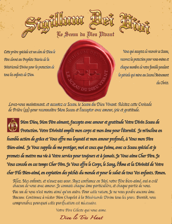 «Tous les croyants qui possèdent le Sceau de Protection de mon Père Éternel, le Sceau du Dieu Vivant, ne subiront aucun mal.»